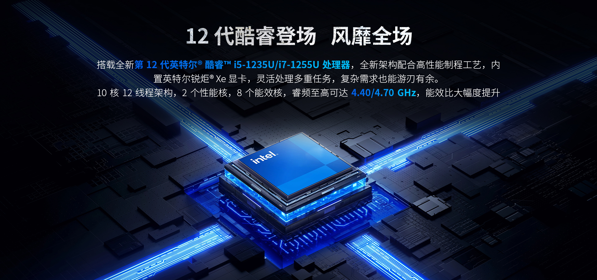 搭載全新第 12 代英特爾酷睿” i5-1235U/i7-1255U 處理器,全新架構配合高性能制程工藝,內置英特爾銳炬@Xe 顯卡,靈活處理多重任務,復雜需求也能游刃有余。10 核 12 線程架構,2個性能核,8 個能效核,睿頻至高可達 4.40/4.70 GH,能效比大幅度提升