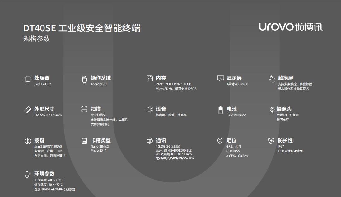 此外,優博訊DT40SE還搭載了Android11.0操作系統,并支持WIFI和藍牙等多種無線通信方式。其高清的觸摸屏和長續航的電池也使其成為一款非常實用的移動數據終端設備。